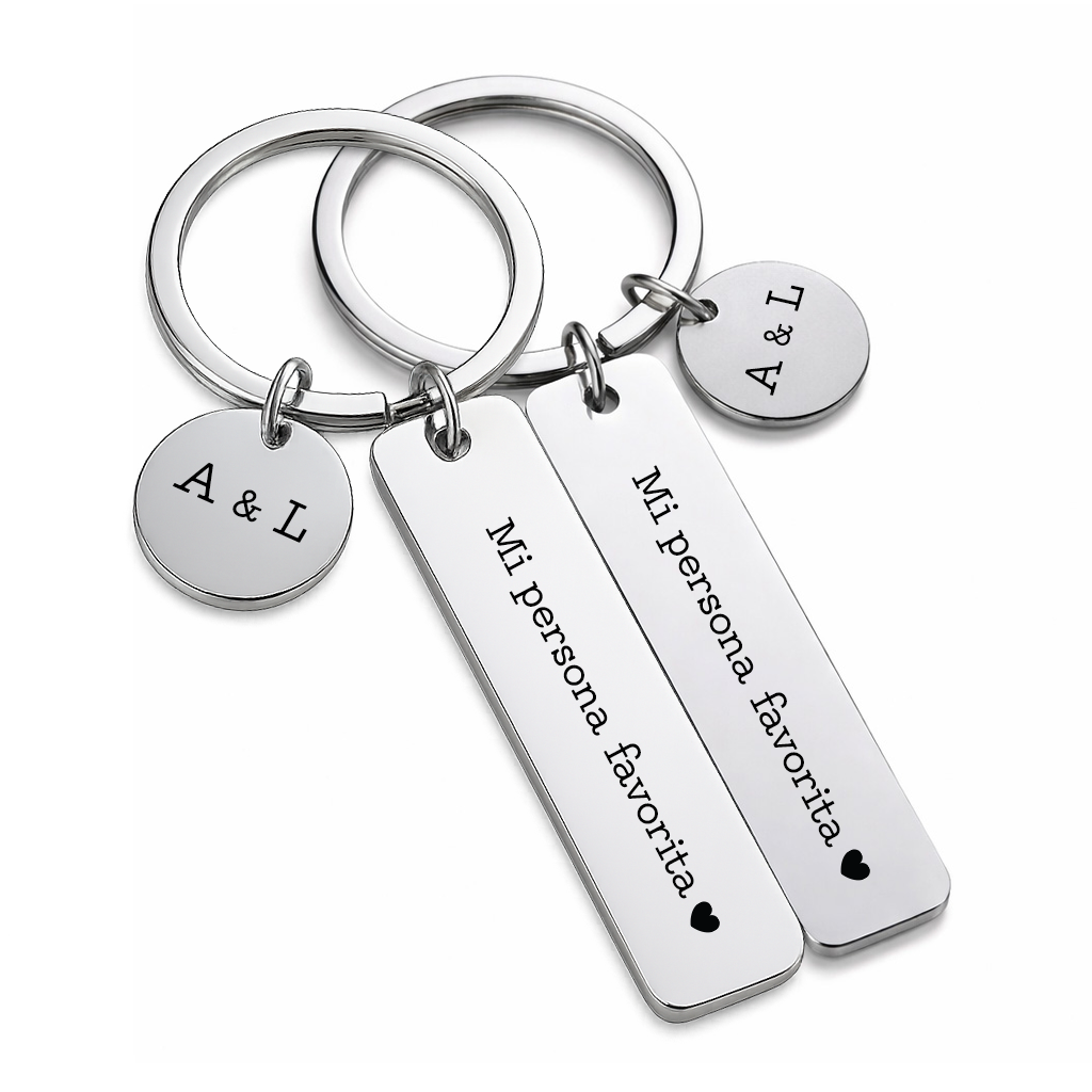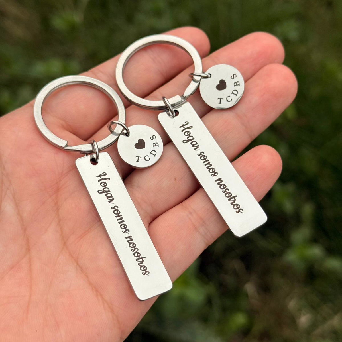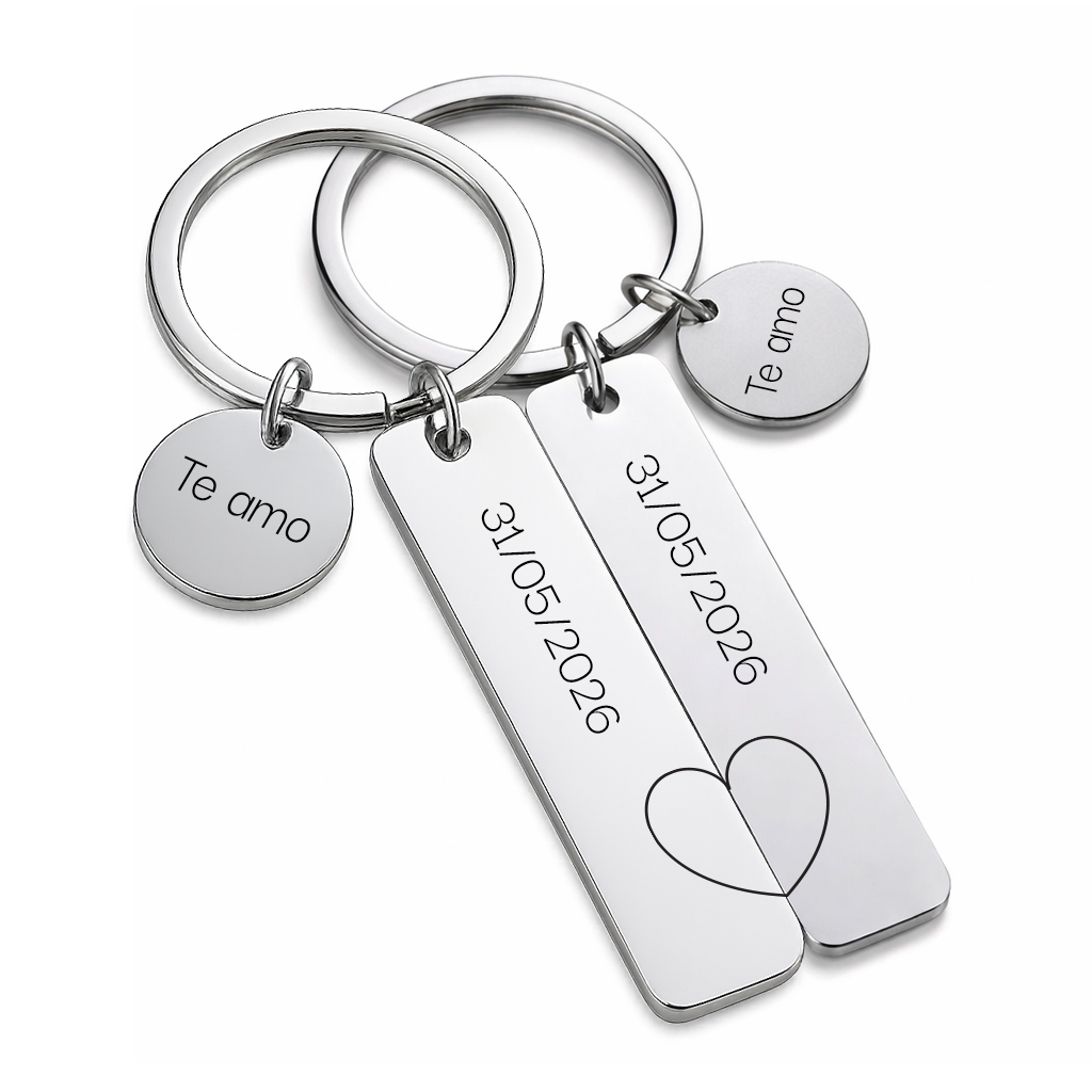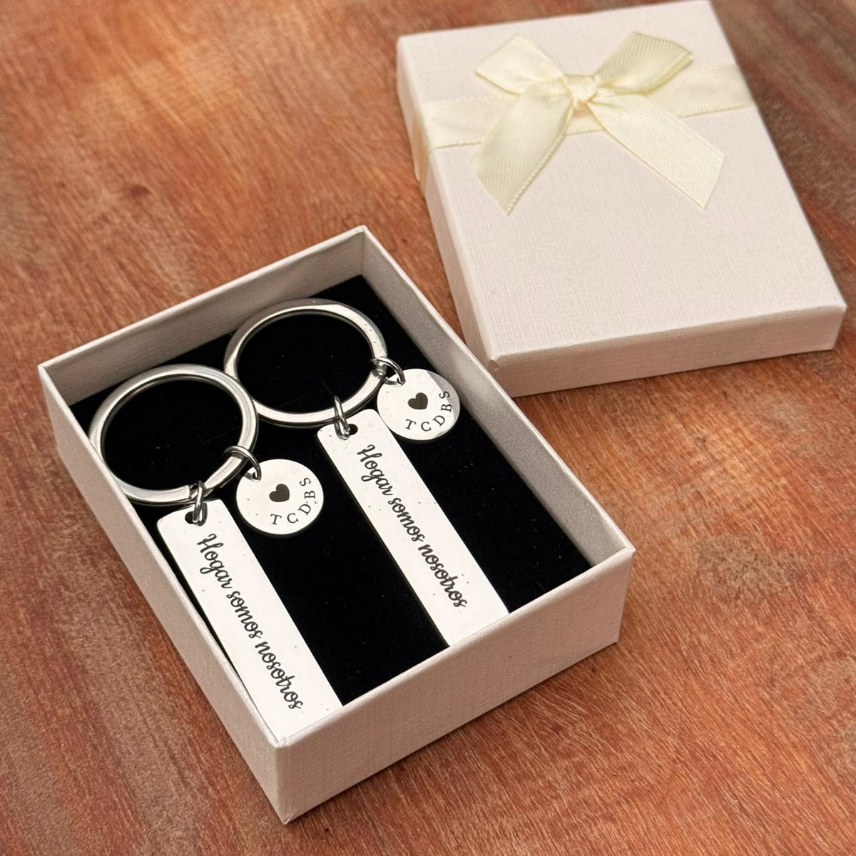 Dos llaveros personalizados que incluye un grabado en ambas del rectangulo y un lado del dije circular con: