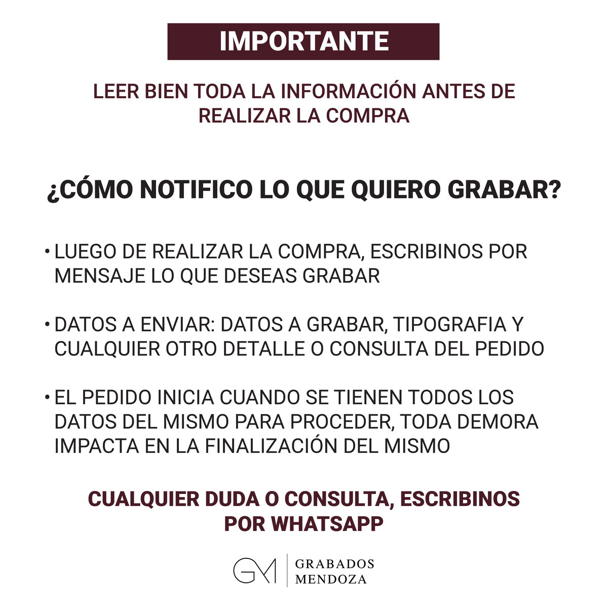 Si querés nos escribis por Whatsapp con tu numero de pedido o te contactaremos nosotros a la brevedad para recibir indicaciones de lo que querés grabar. Una vez tomada toda la información, preparamos un boceto digital y te lo enviamos para tu aprobación. Es la instancia de realizar ajustes, cambios de letra, etc.