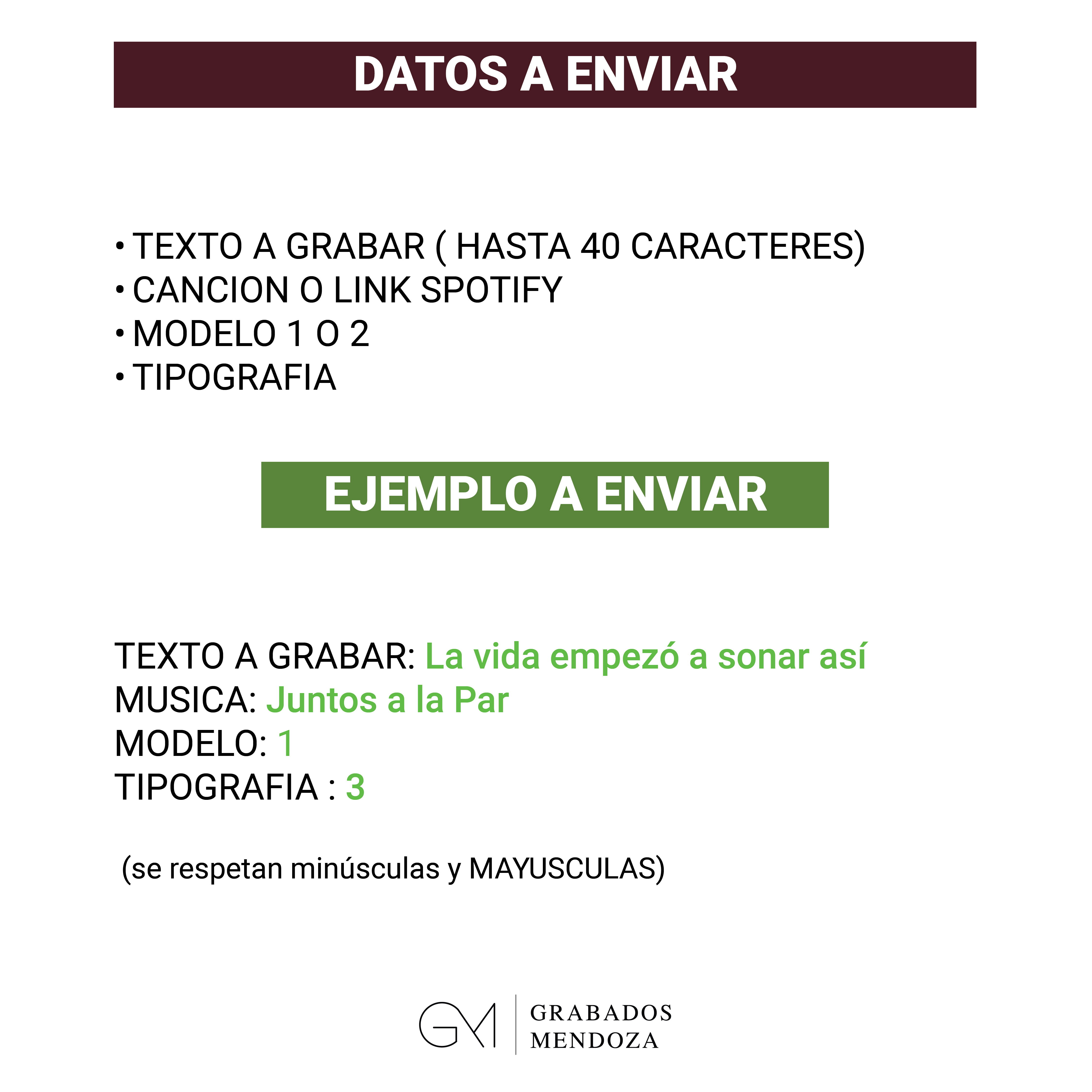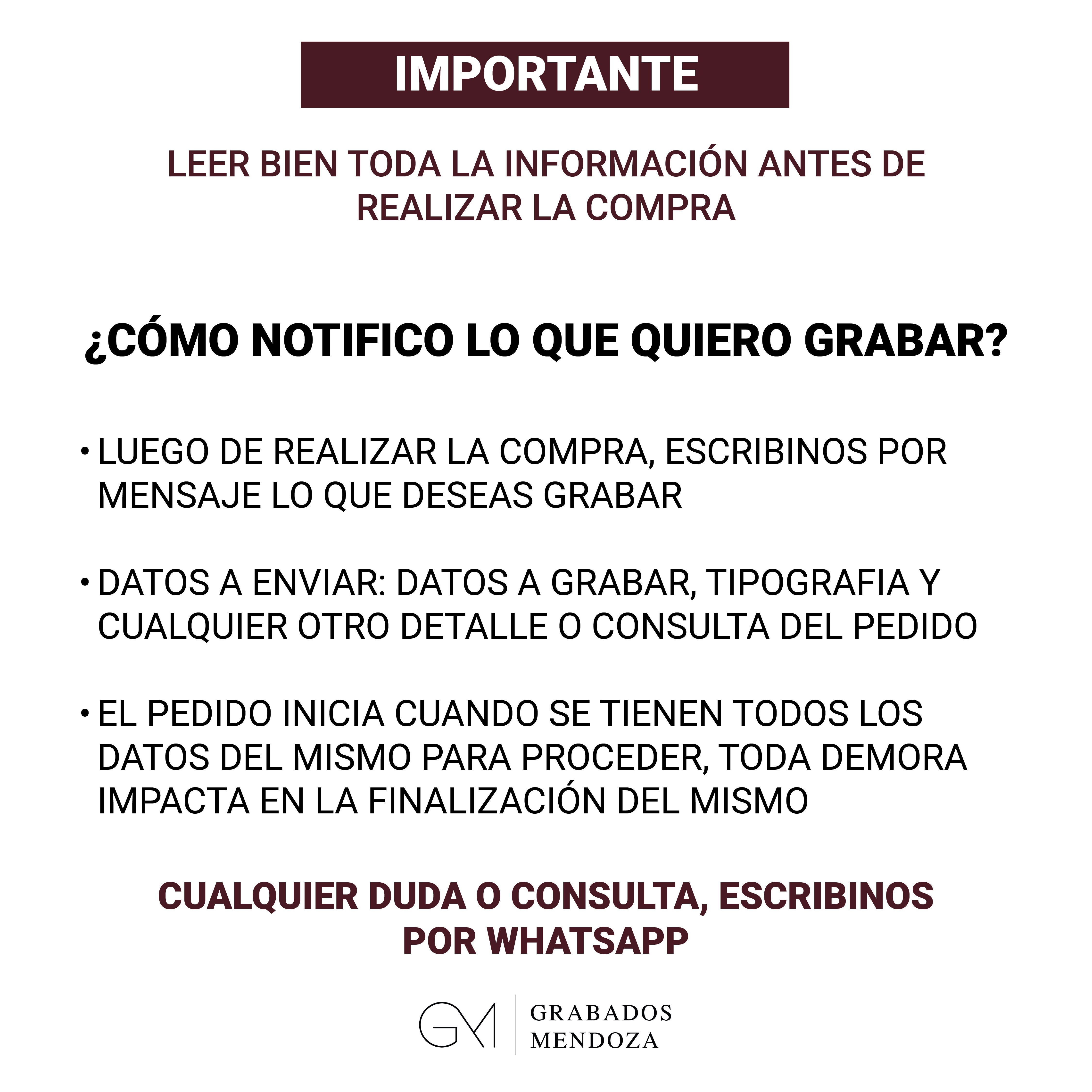 Si querés nos escribis por Whatsapp con tu numero de pedido o te contactaremos nosotros a la brevedad para recibir indicaciones de lo que querés grabar. Una vez tomada toda la información, preparamos un boceto digital y te lo enviamos para tu aprobación. Es la instancia de realizar ajustes, cambios de letra, etc.