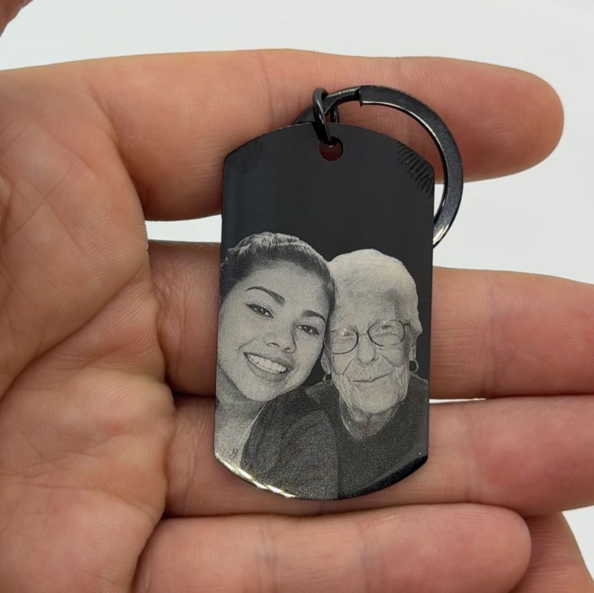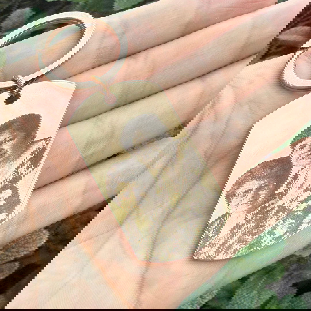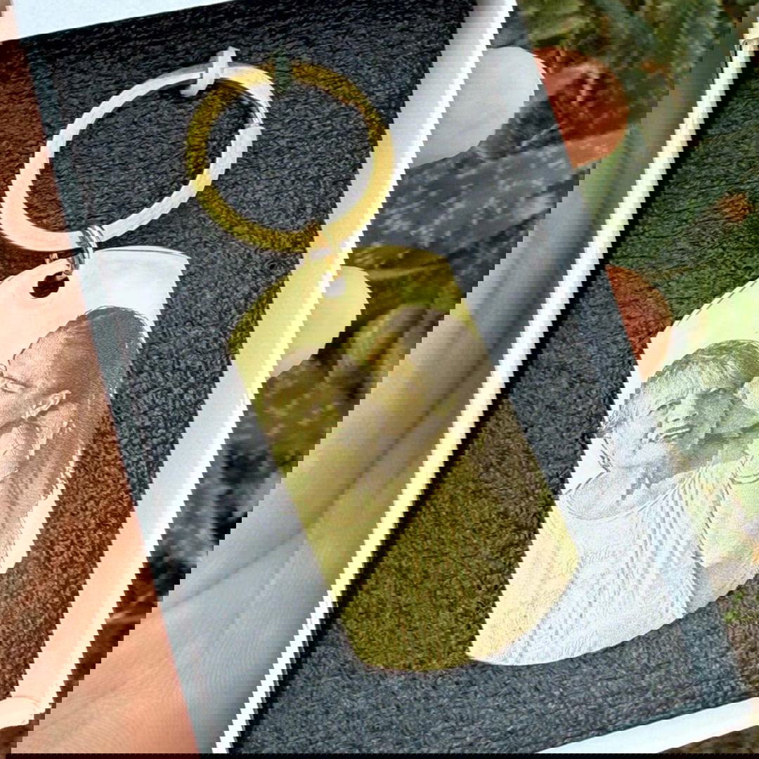 Un llavero personalizado que incluye un fotograbado y una frase o dedicatoria del otro lado.