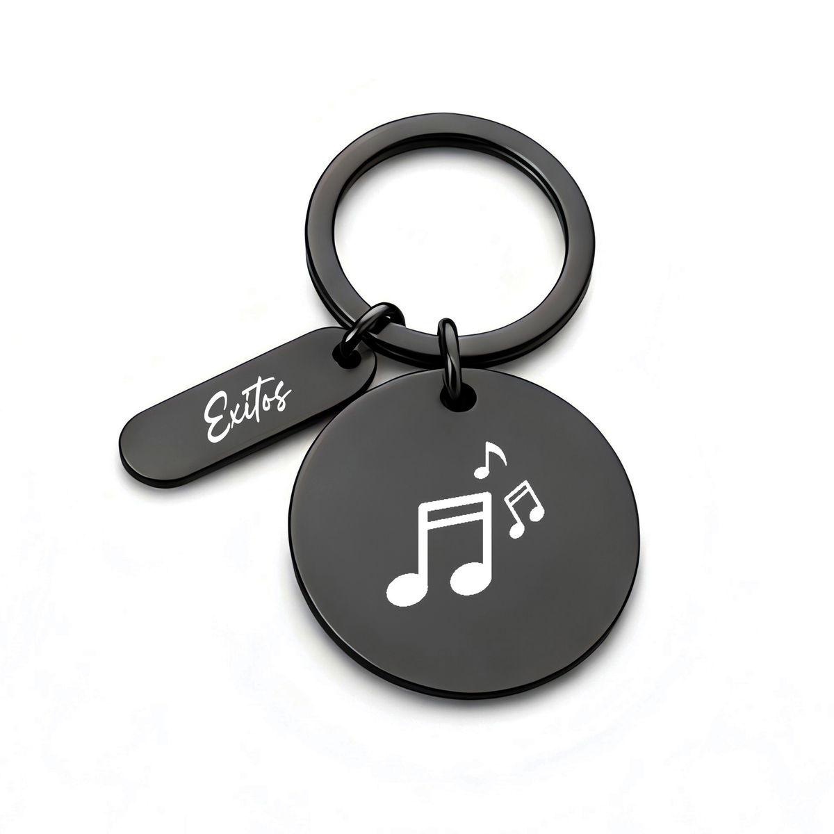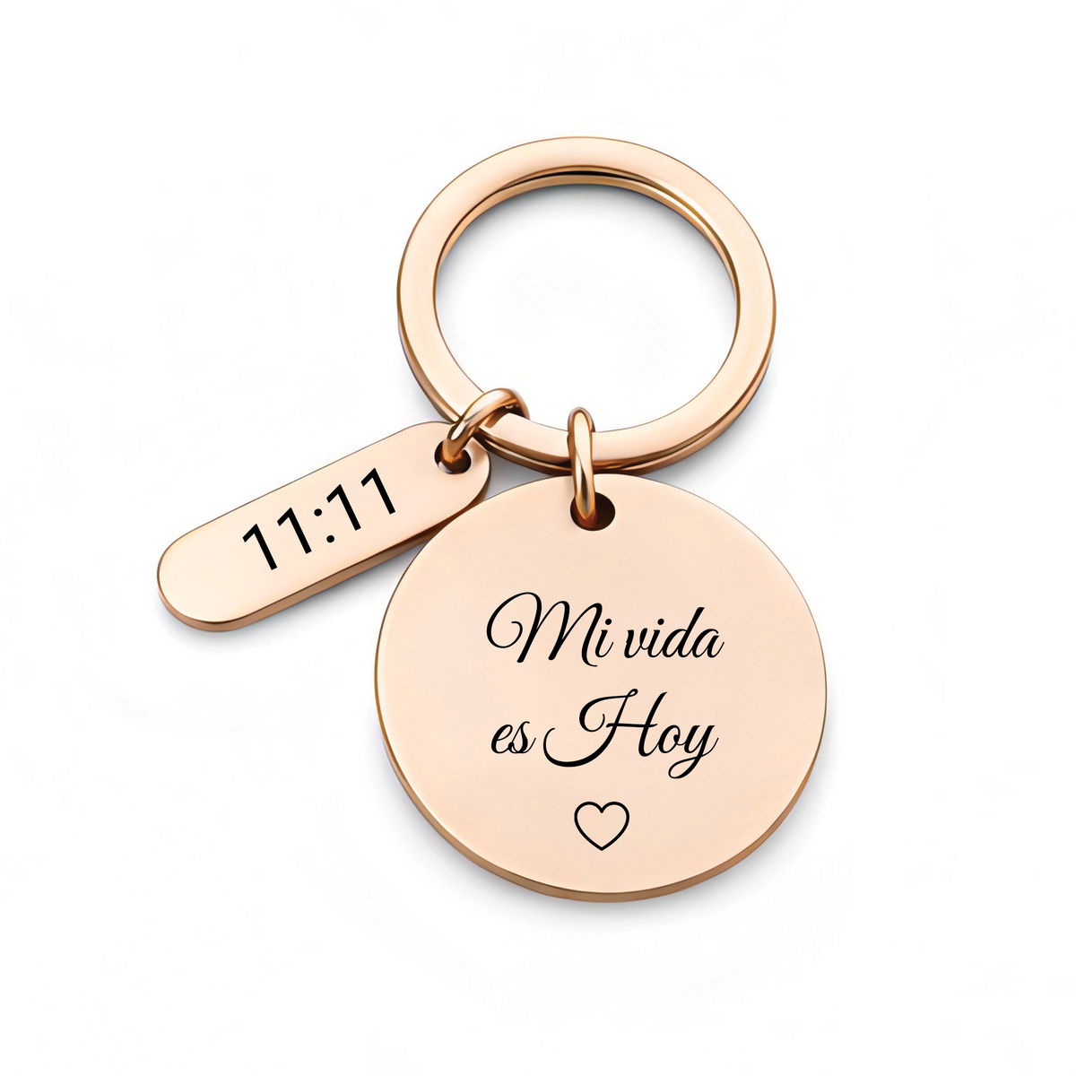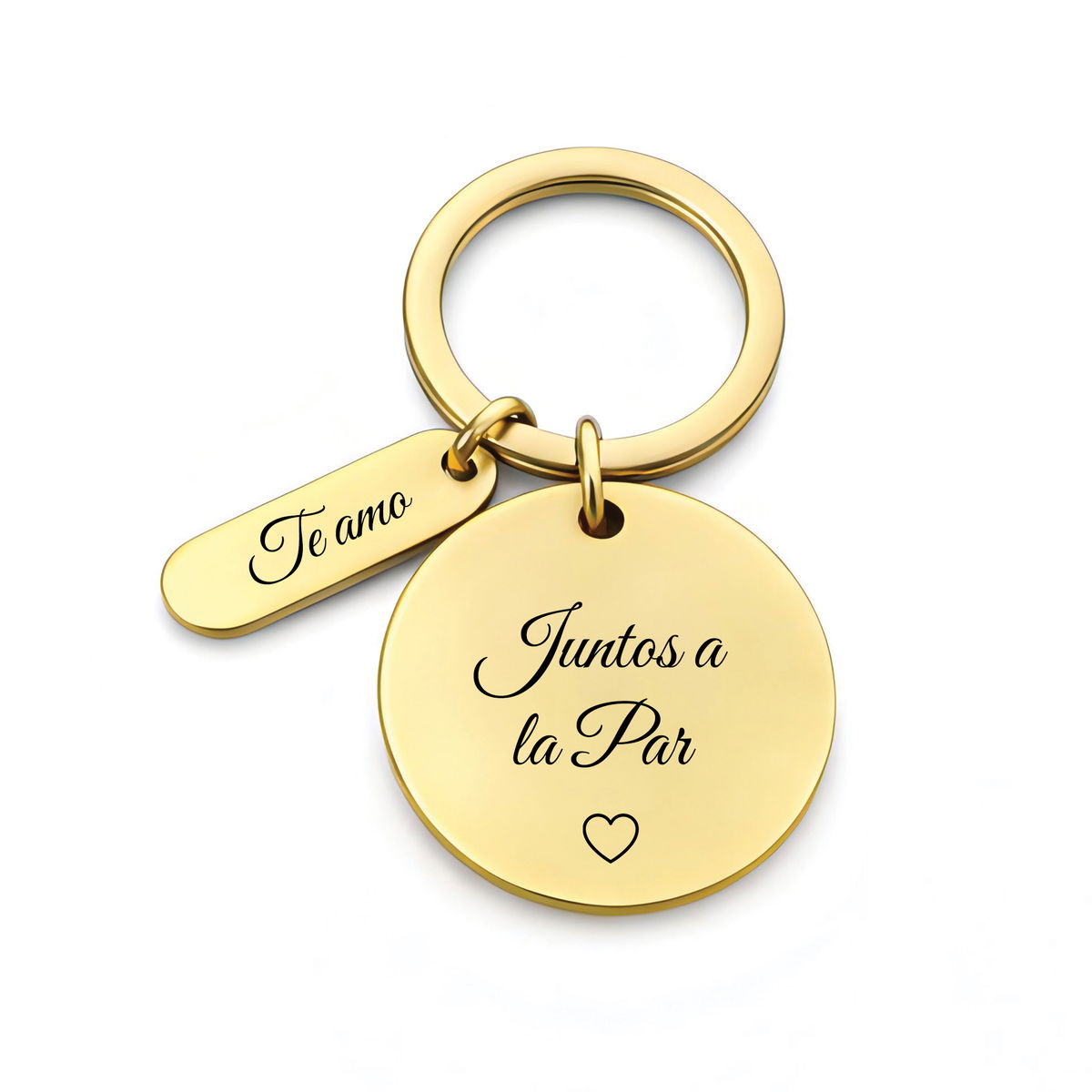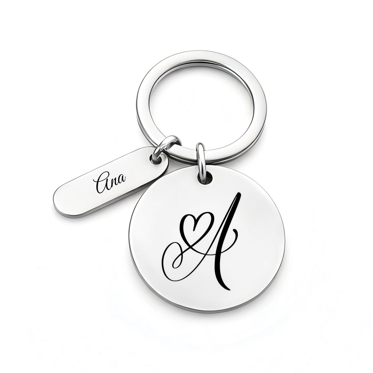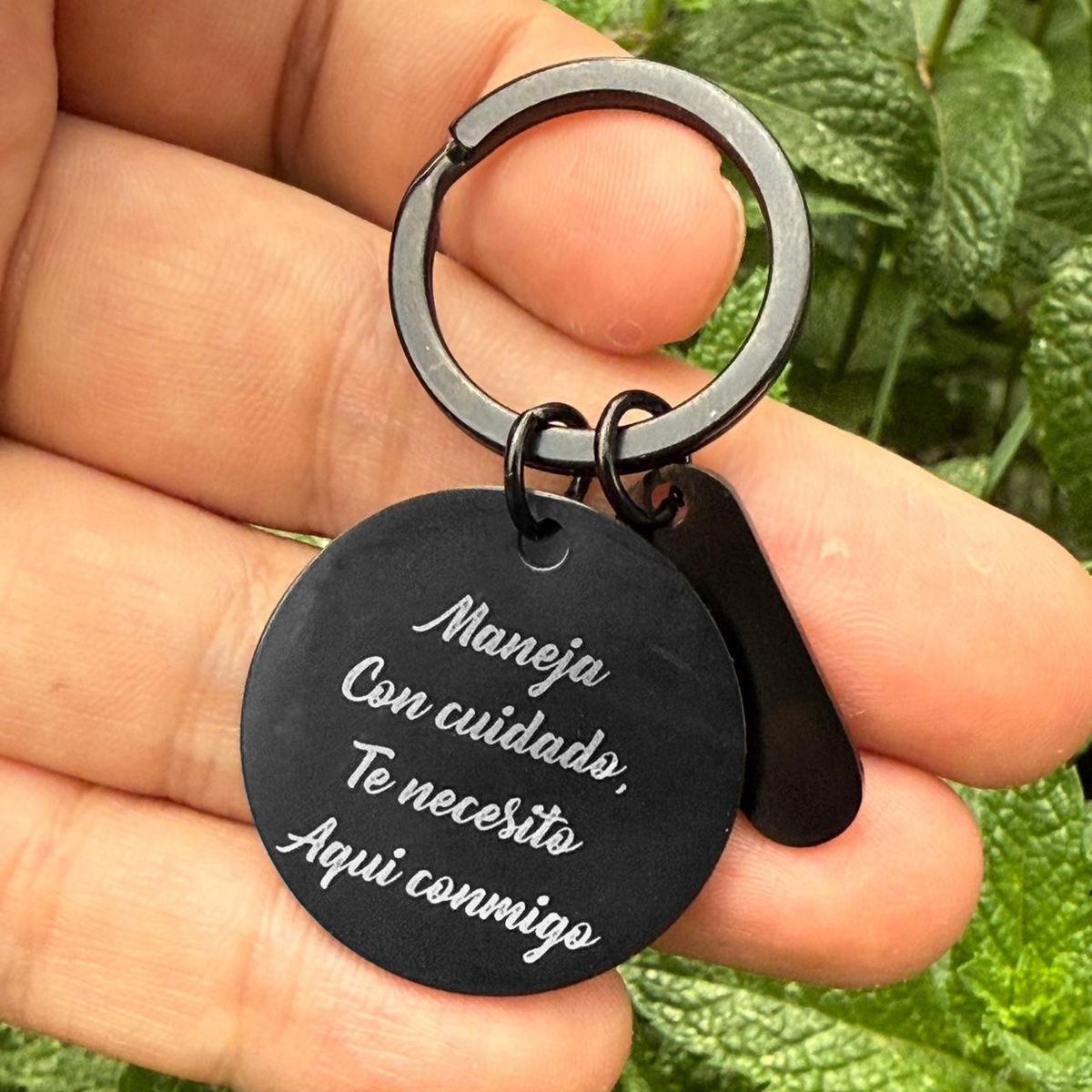 Un llavero circular con dije, que incluye un Grabado Personalizado en ambas caras del circulo y un lado del dije