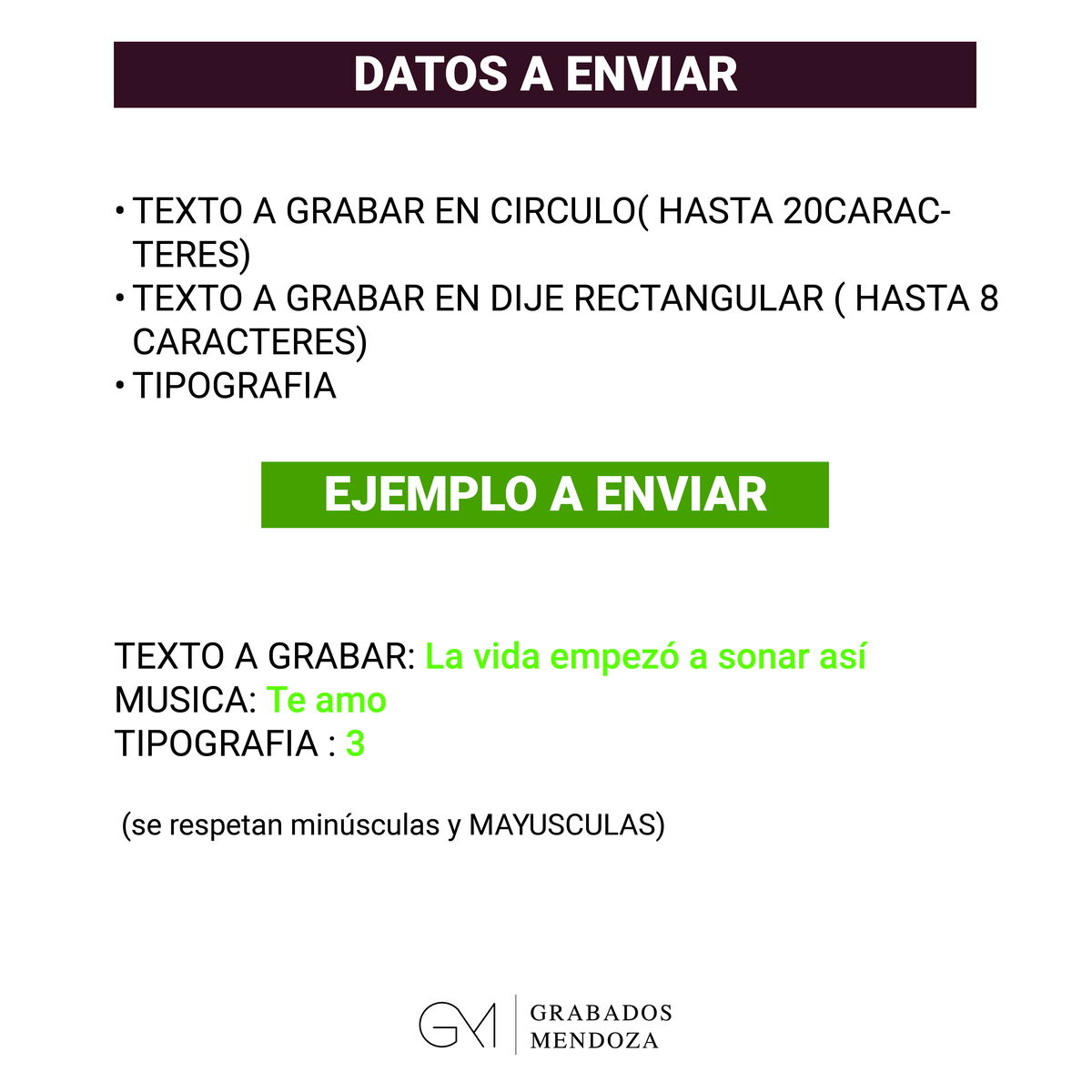 1) Envíanos la dedicatoria o frase corta para el Circulo (Hasta 20 caracteres por lado)
