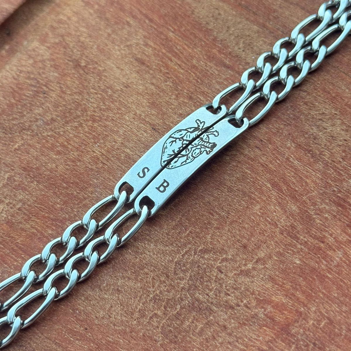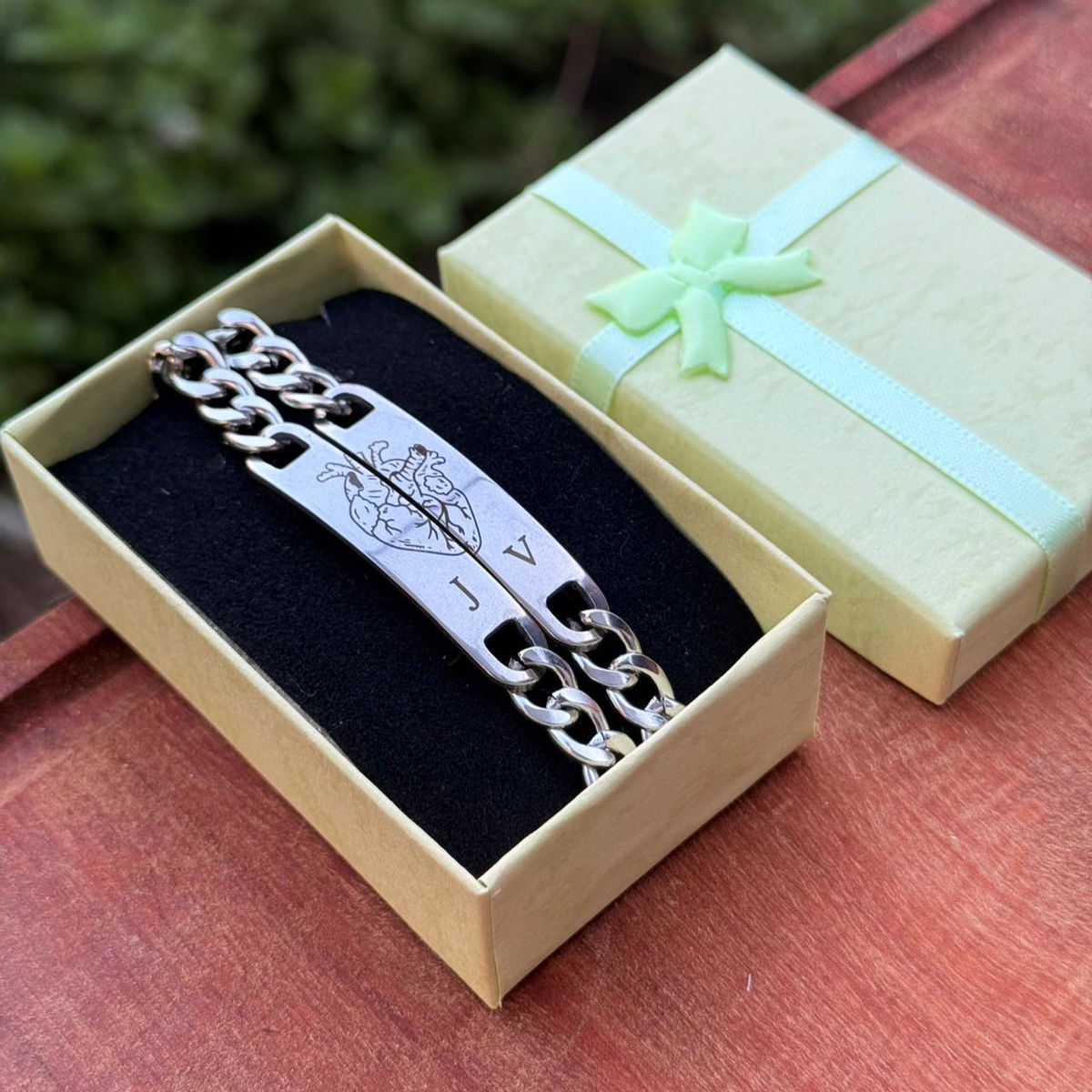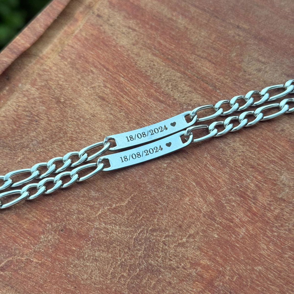 El precio publicado es por DOS pulseras + grabado en ambas caras (Icono Corazón + iniciales y fecha)