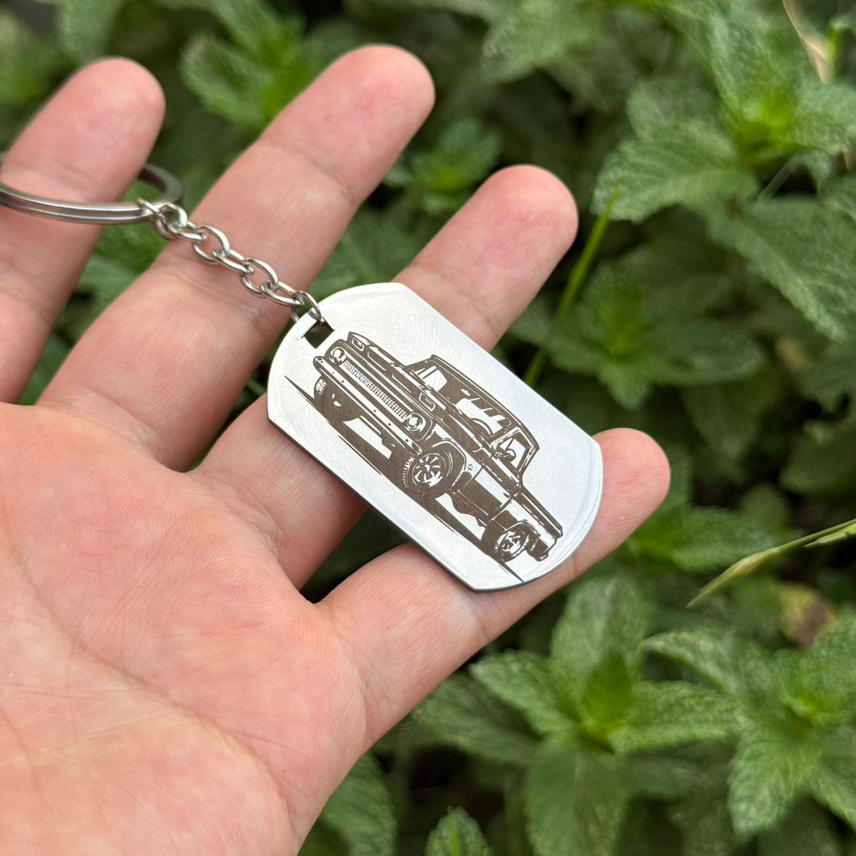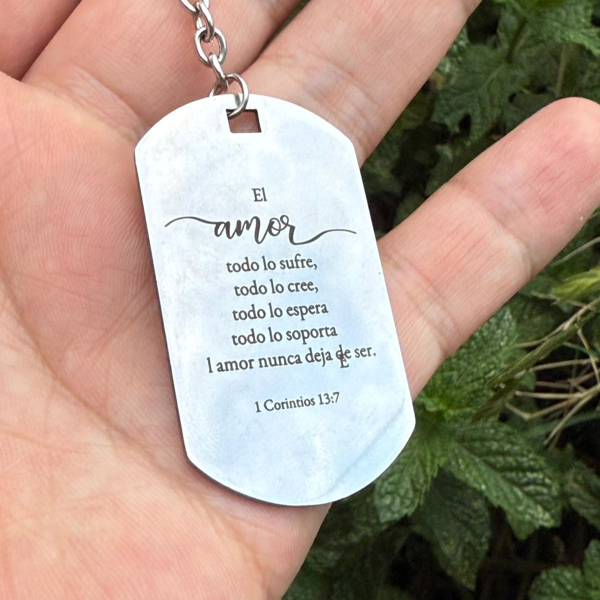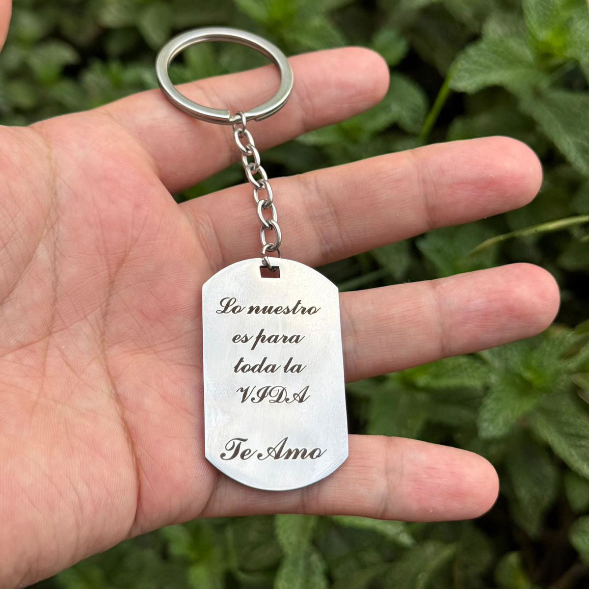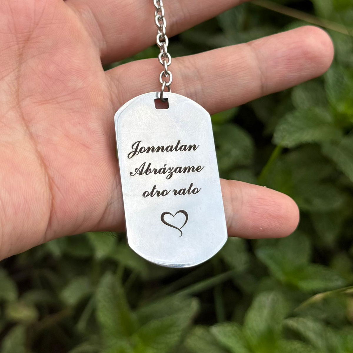 Un llavero personalizado que incluye un grabado en ambas caras con: