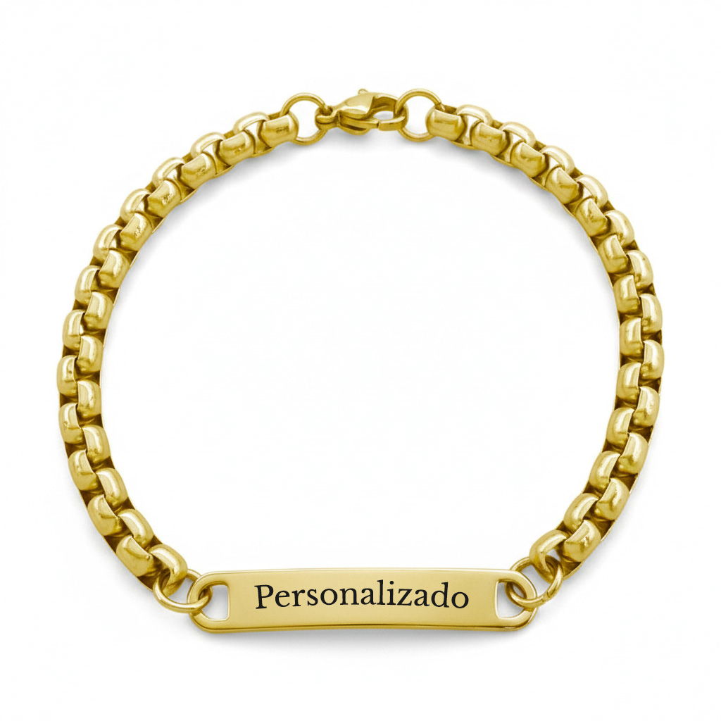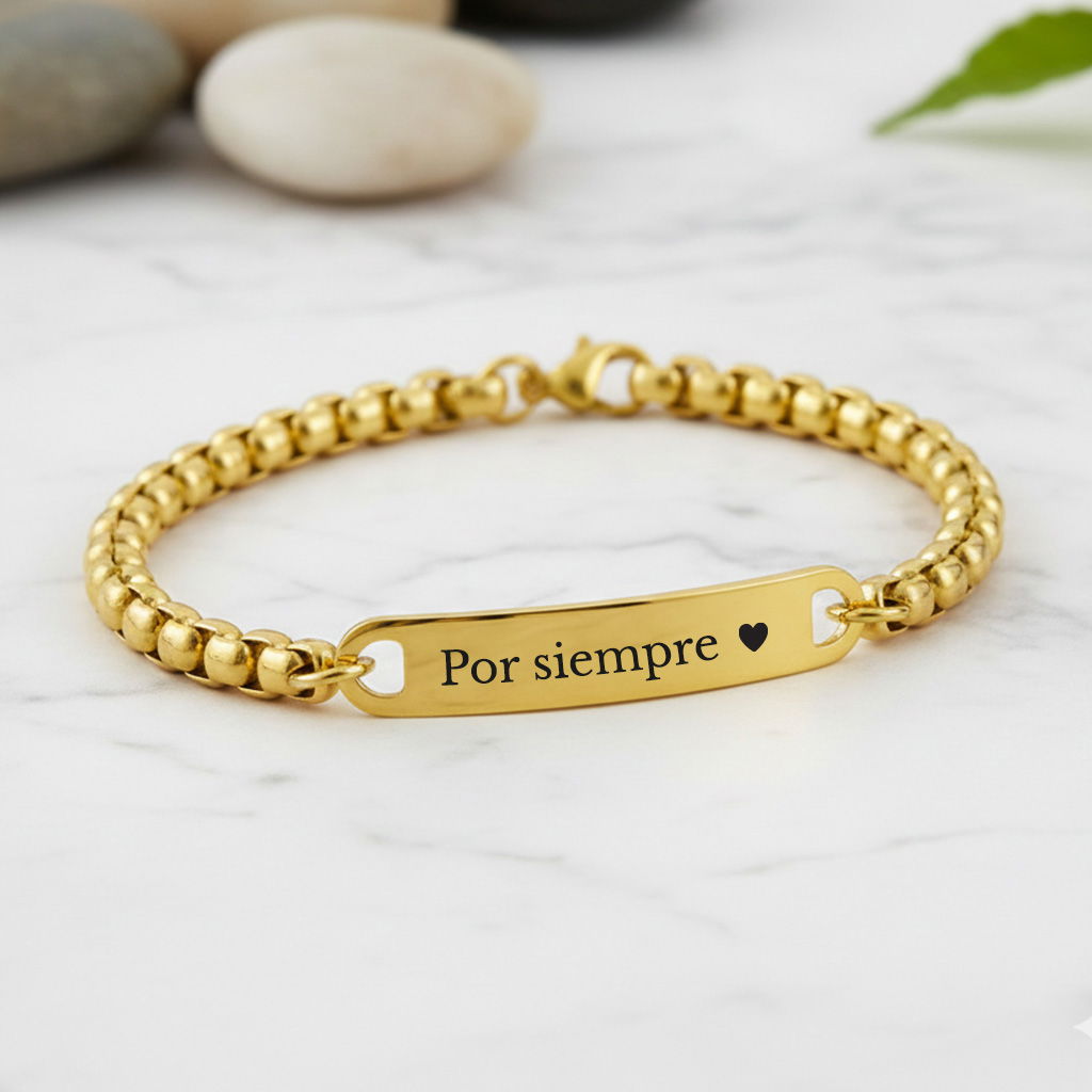 Pulsera en Acero quirúrgico dorado personalizable, incluye el grabado de ambas caras con:
