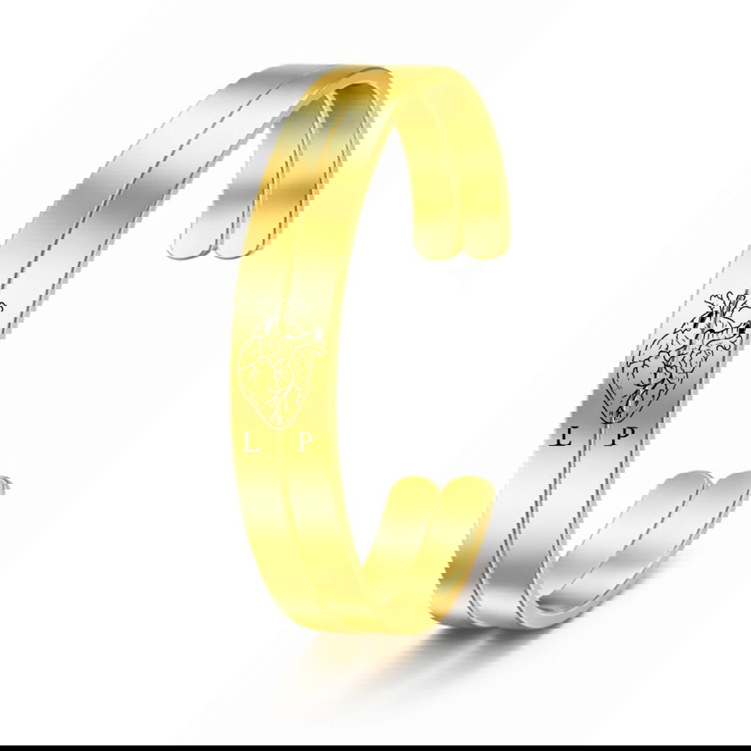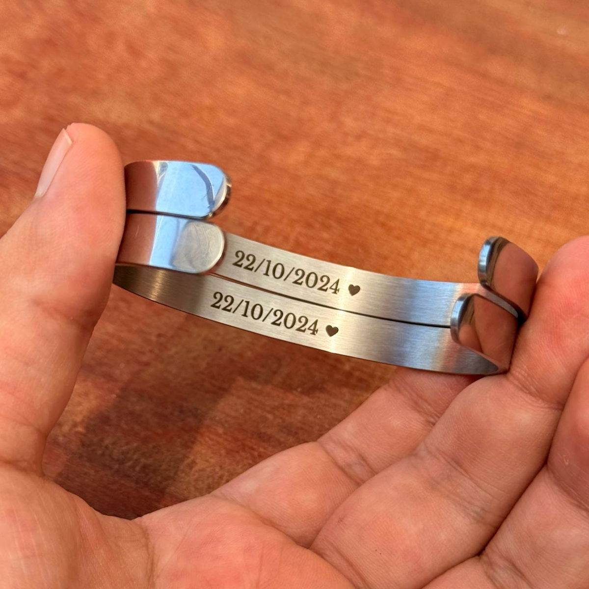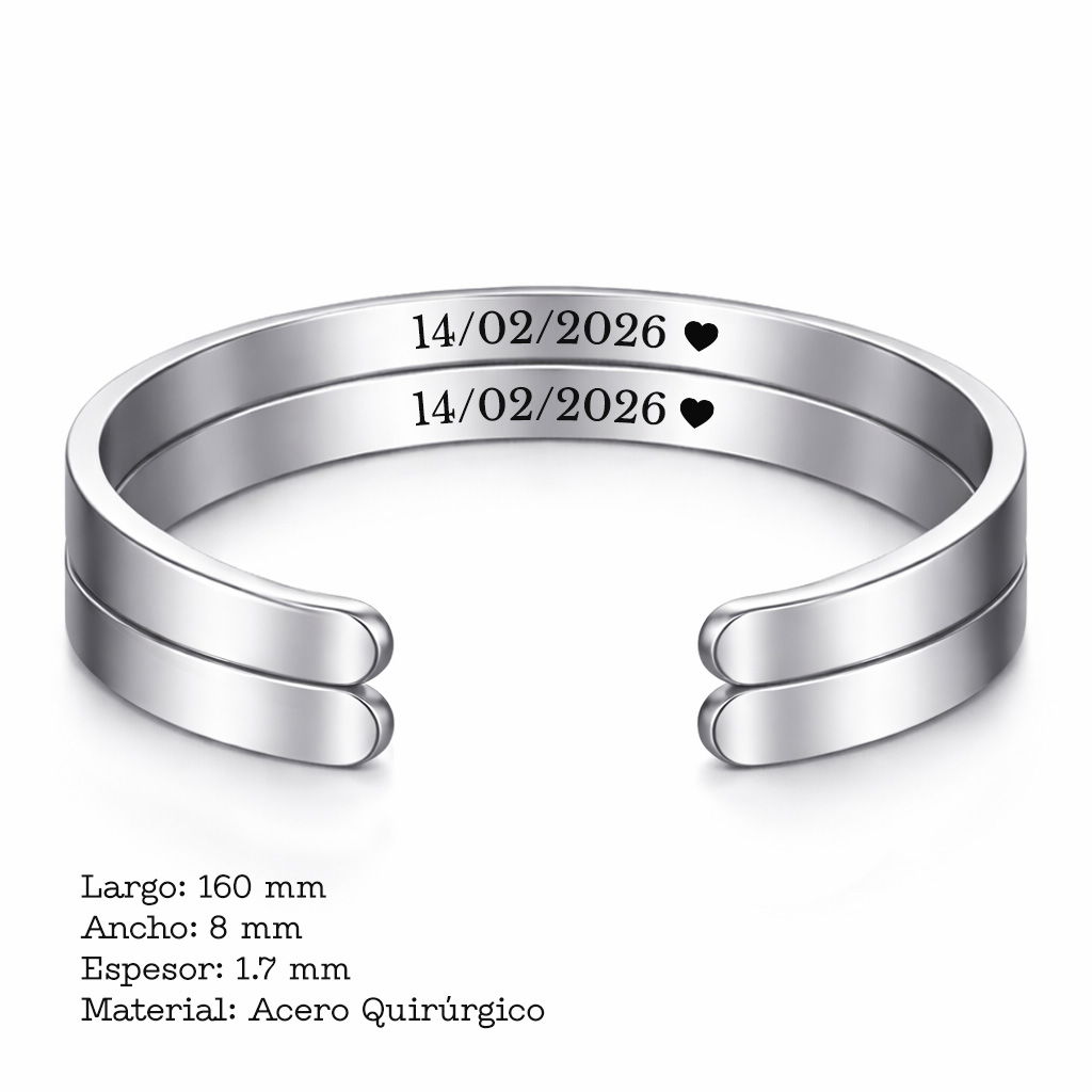 Dos pulseras en acero quirúrgico personalizable, incluye el grabado de ambas caras con icono de CORAZON y: