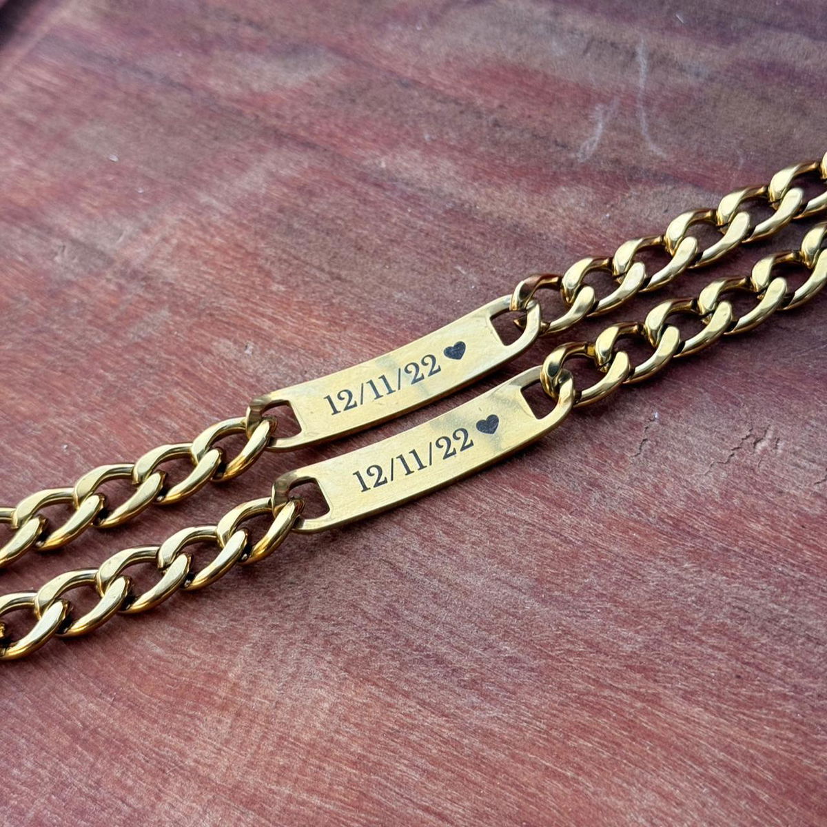 Dos pulseras en acero quirúrgico personalizable, incluye el grabado de ambas caras con icono de CORAZON y: