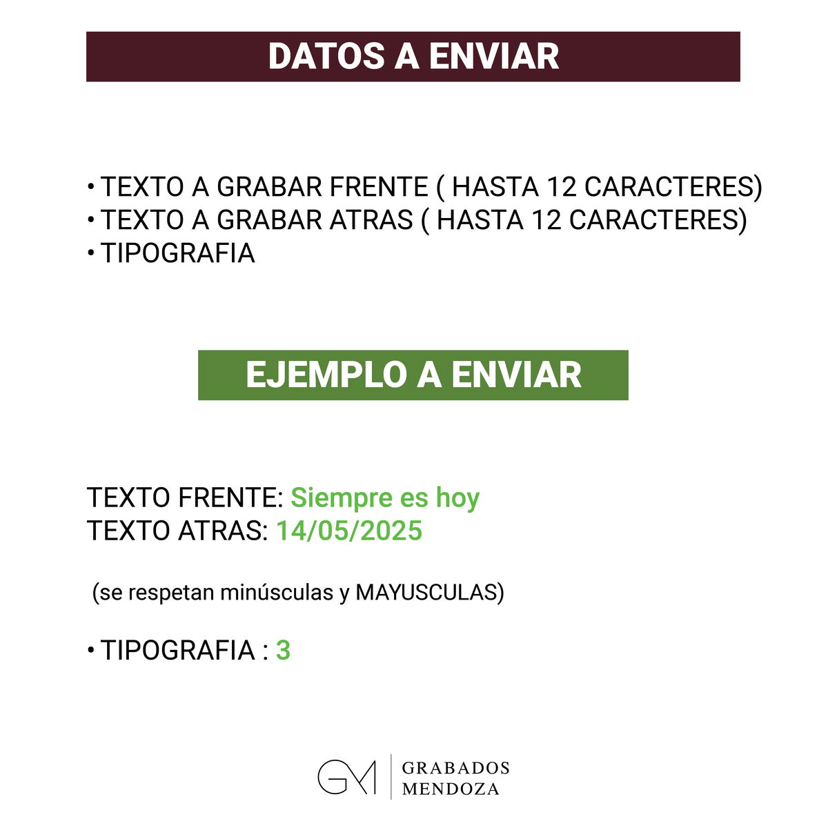 3) Envíanos la dedicatoria o frase corta para la parte trasera (Hasta 12 caracteres)