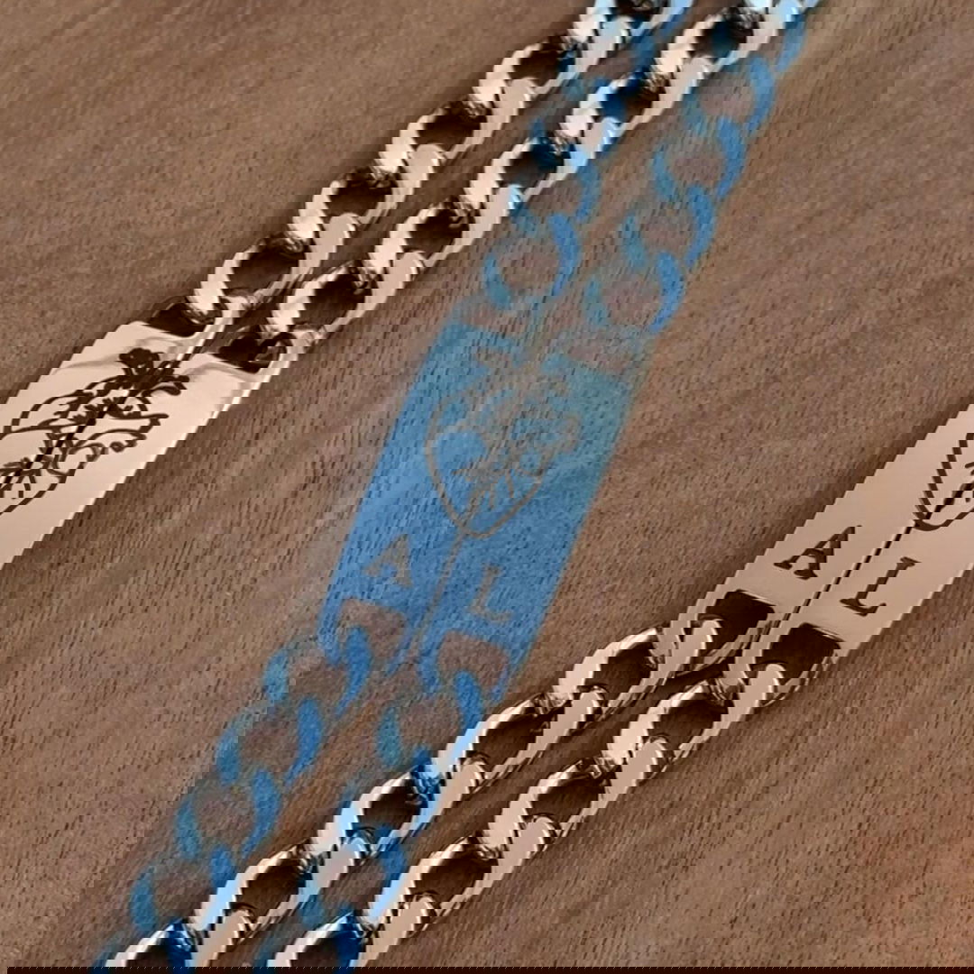 Dos pulseras en acero quirúrgico personalizable, incluye el grabado de ambas caras con icono de CORAZON y: